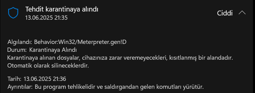 - Maalesef AV, shellcode çalıştıktan kısa bir süre sonra erişimin meterpreter olduğunu anladı ama erişimi kesmedi sadece uyarı verdi.