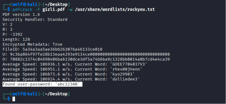 Görsel-2: Parola korumalı PDF dosyasına “pdfcrack” aracı ile parola deneme saldırısı başlatıyoruz ve bir süre sonra parolayı tespit ediyoruz. Bingo!!!